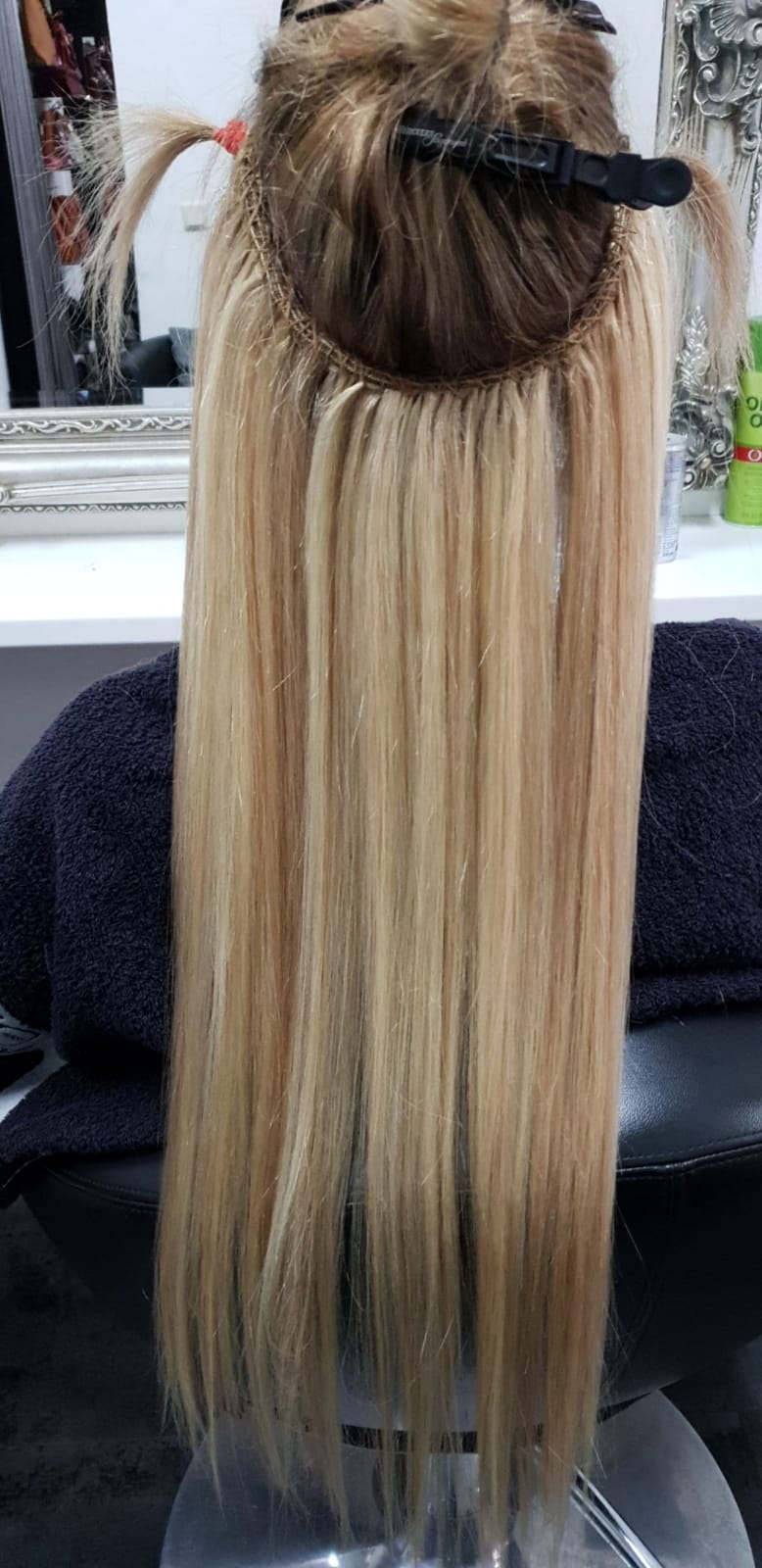 (auch Weaving genannt) von Verlängerungen. Bei diesem Verfahren werden die eigenen Haare weniger belastet als bei der herkömmlichen Art wie z.B. das Einschweißen (Bonding). Die Haare werden geschont, da weder Hitze benötigt noch Klebstoffe verwendet werden.